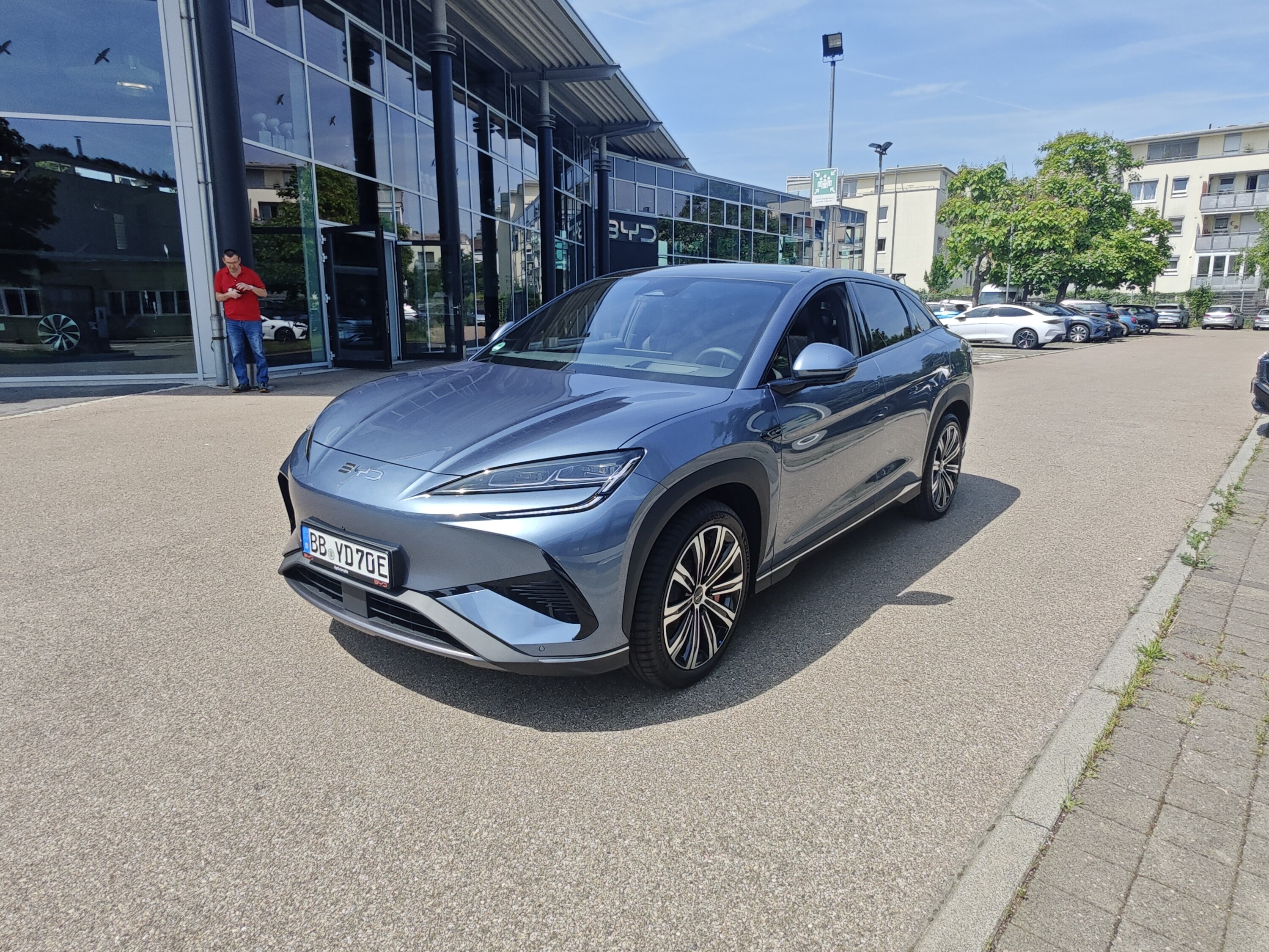 Vor dem neuen gläsernen BYD Auslieferzentrum. Drinnen stehen viele Fahrzeuge für die Übergabe bereit.